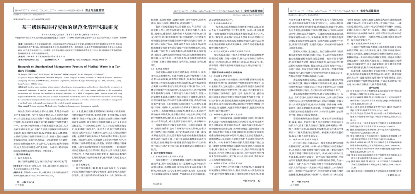 本公司于2020年与“中国医学科学院阜外医院深圳医院”联合开展“某三级医院医疗废物的规范化管理实践研究”的课题立项,7位专家(其中医院4位,本公司3位)历时10个月,在2021年顺利结题,并发表《某三级医院医疗废物的规范化管理实践研究》的论文。