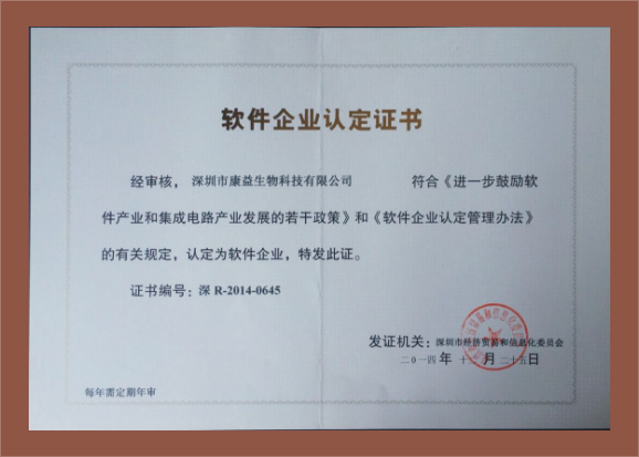 2014年12月,公司首次被“深圳市经济贸易和信息化委员会”认定为“软件企业”,标志着公司独创高科技产品,不仅硬件研发能力得到国家政府部门的认可,同时软件开发能力也得到认定,是名副其实的集软件、硬件为一体的高新技术企业。